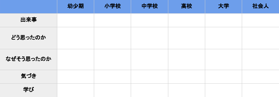 - 世代ごとにこれまでの印象的な出来事を記入する
